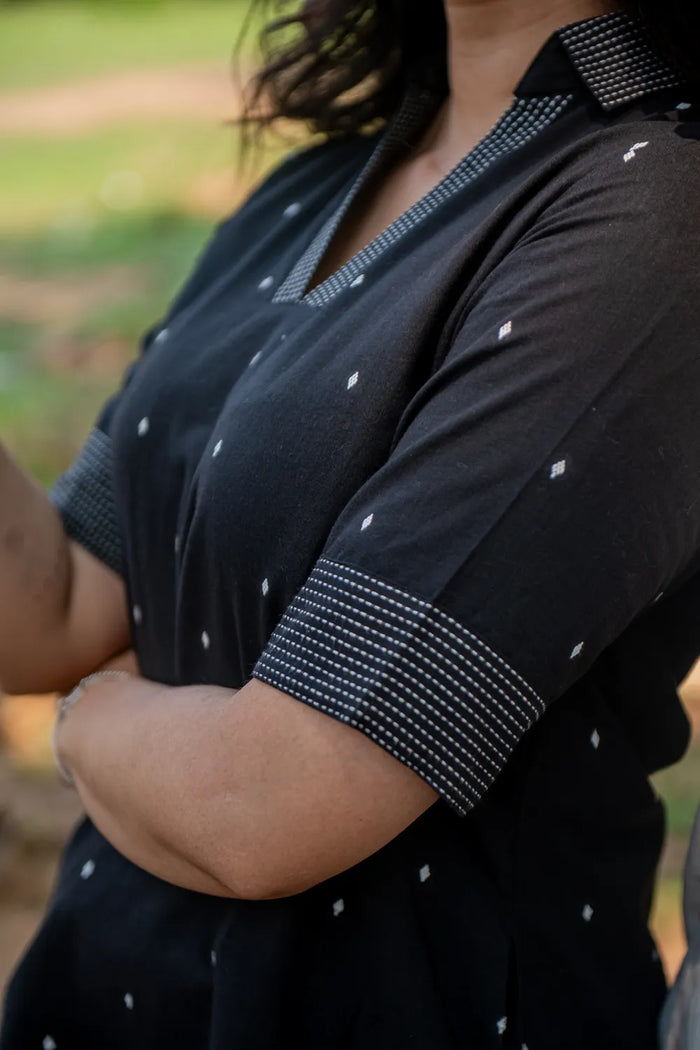 Effortlessly chic, this Black & White Pure Cotton Top features a refined V-collar neckline accented with delicate white woven motifs that add a handcrafted appeal. Designed with a subtle lining for enhanced structure and comfort, it’s ideal for both workwear and casual outings. The breathable cotton fabric ensures all-day comfort, making it a versatile wardrobe essential with understated elegance.