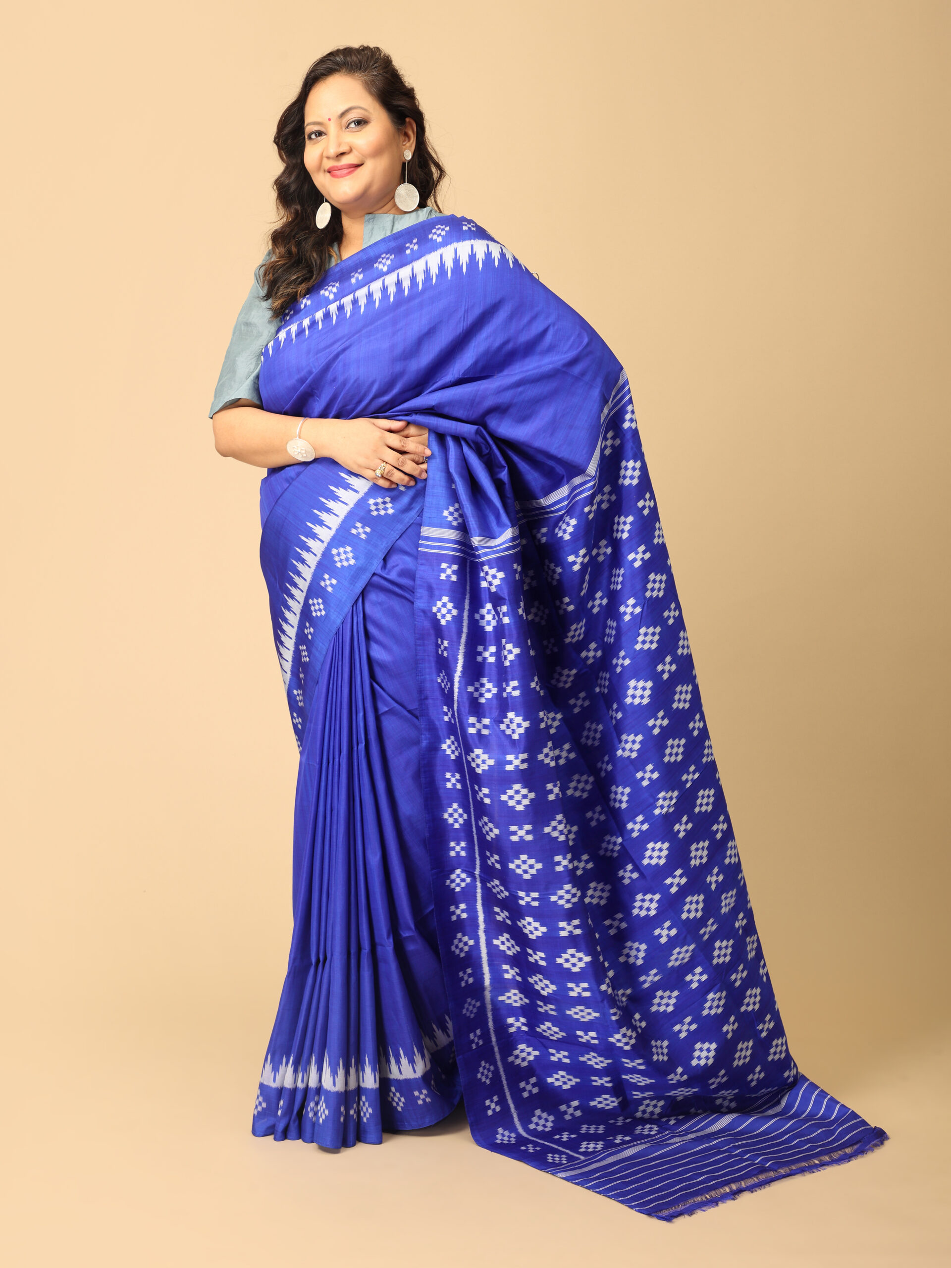 Stunning blue and white Maniabandha Silk Saree with pasapalli pattern. No Blouse piece.The weaves of Maniabandha and Nuapatna in Odisha are made in pitlooms with silk or cotton using the ikat technique which involves tie-dying the yarn before weaving. The motifs are symbolic each telling a story of the regions culture and history.
