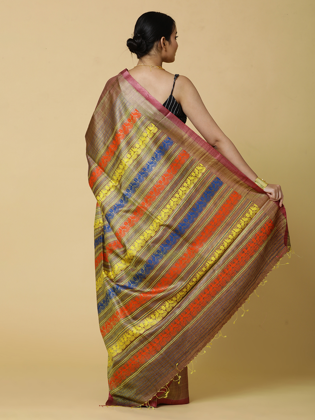 The warm earth tone, intermittently woven in brown and yellow, evoking subtle lustre.The true magic of this saree lies in its exquisite butterfly motif. Delicate, handwoven butterflies seem to flutter across the fabric, rendered in intricate detail.
