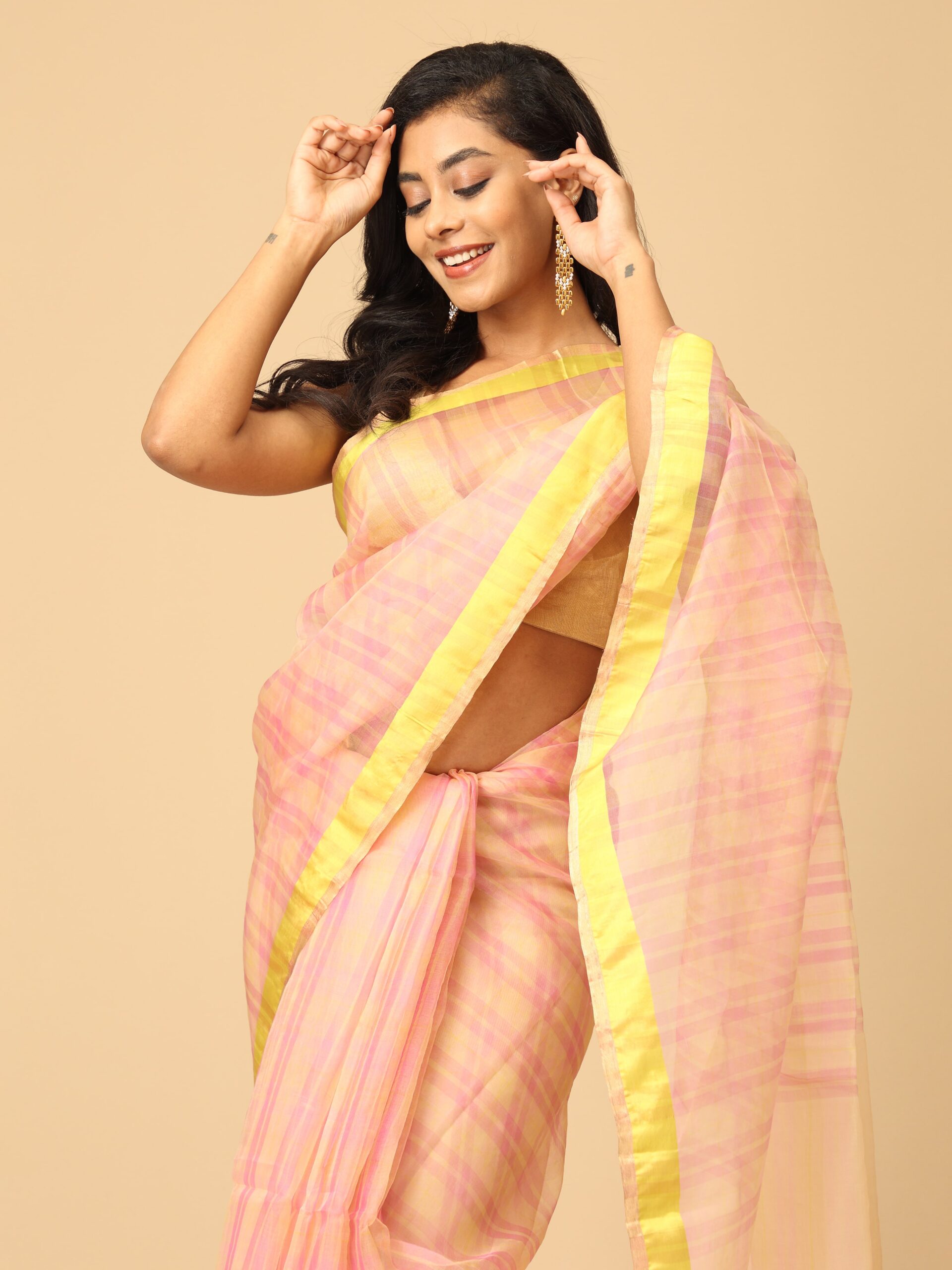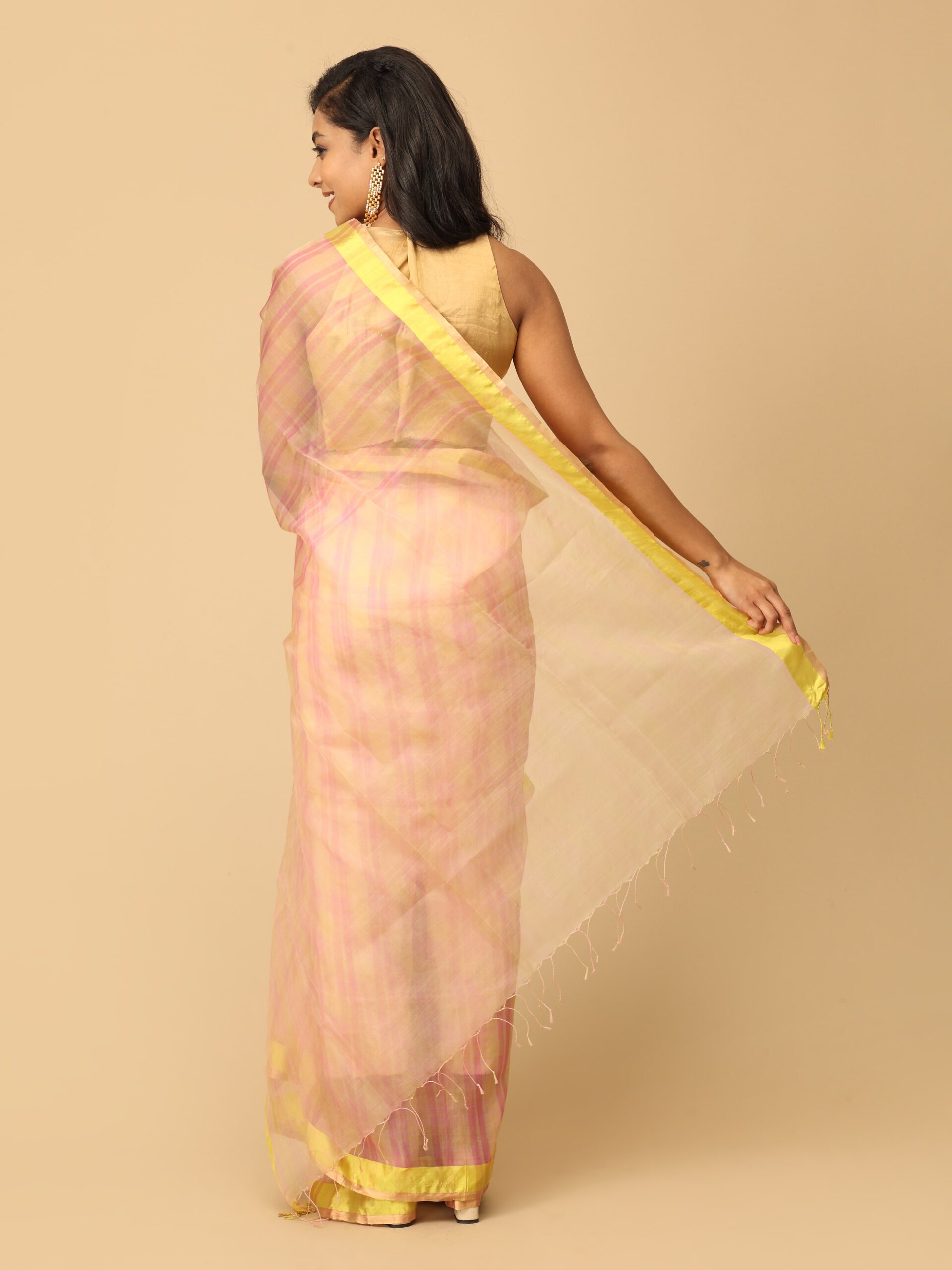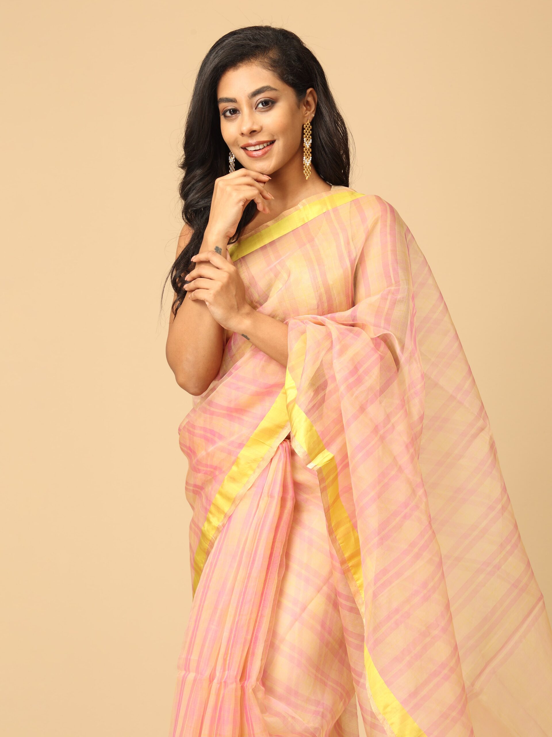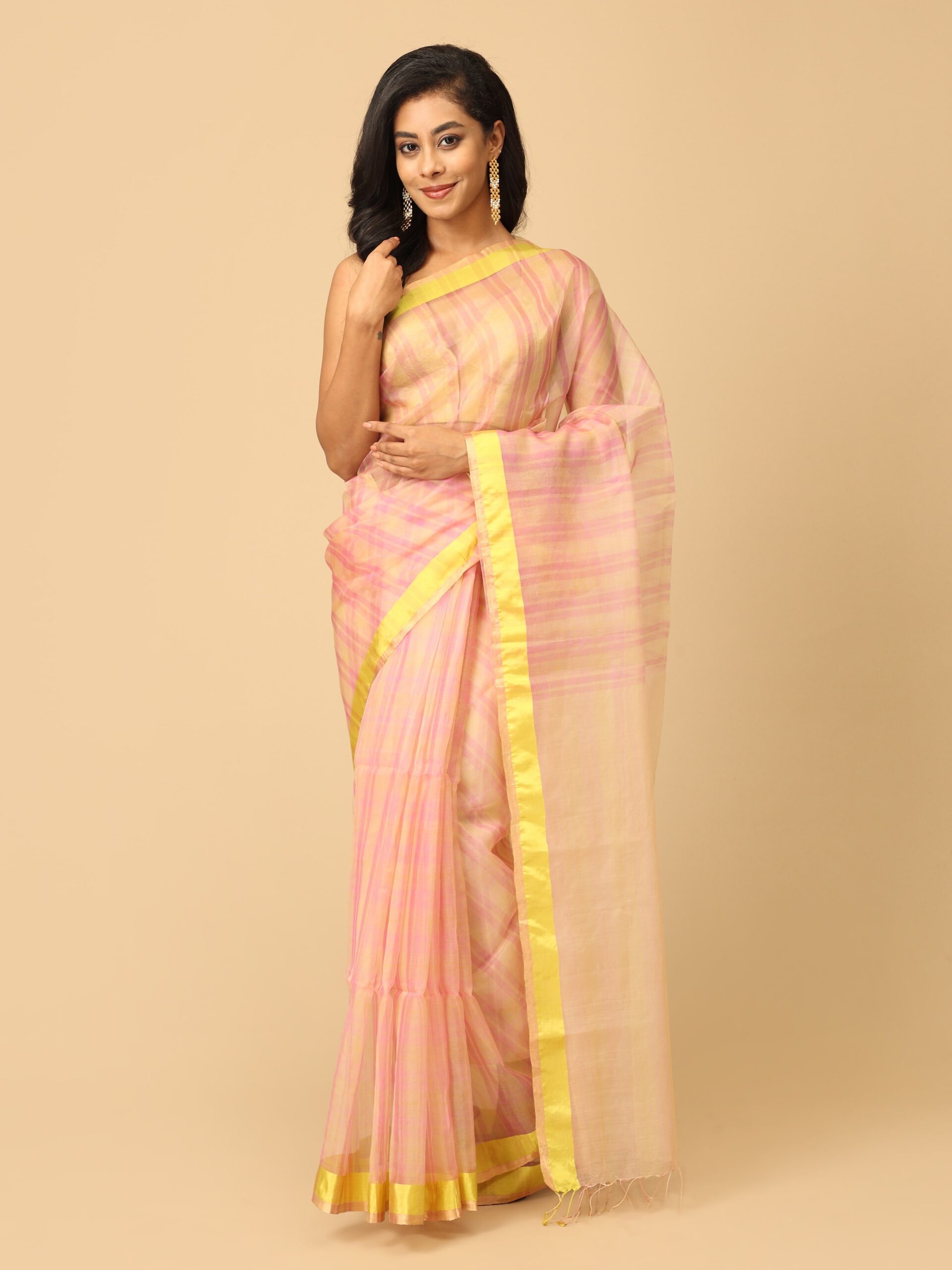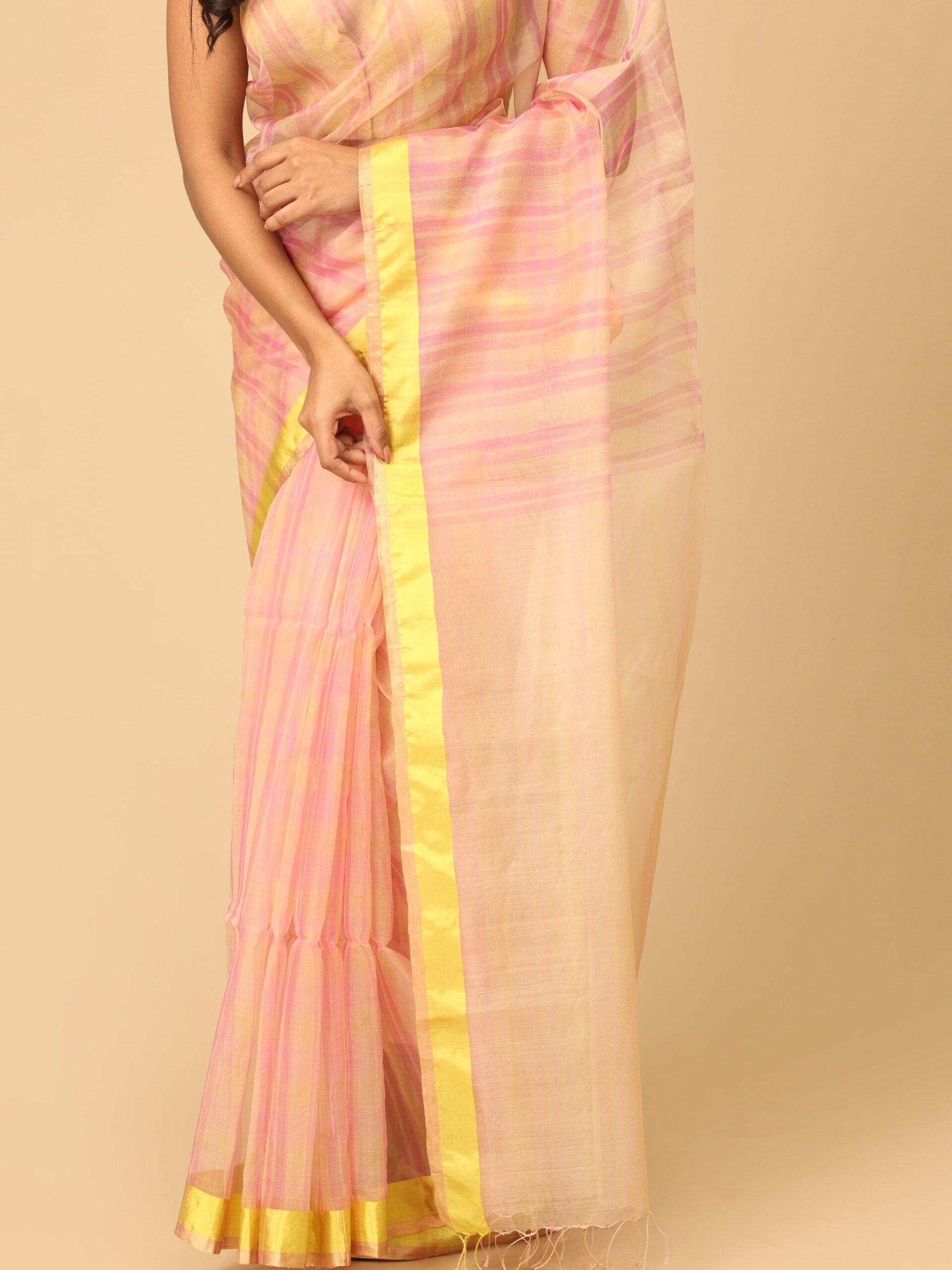 fuchsia pink and yellow stripes saree with neon green satin border handwoven saree in organza base from West Bengal. Perfect wear for a festive occasion or wedding ceremony.