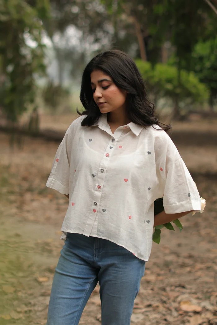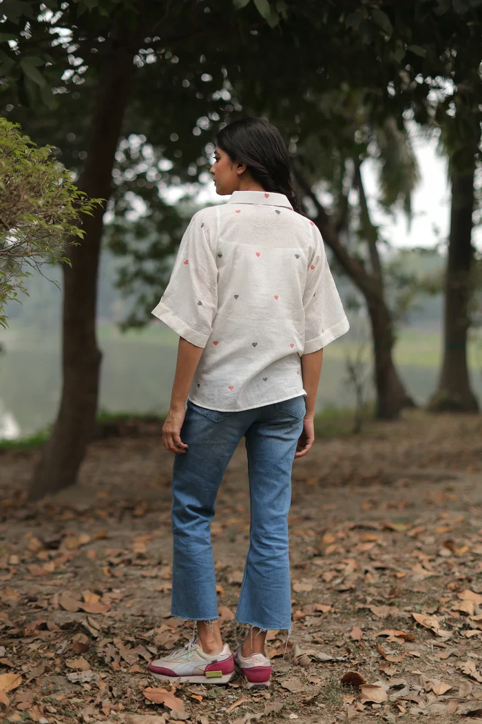 Add a hint of charm to your wardrobe with this Red Heart Woven White Shirt, crafted from handwoven pure cotton. Adorned with delicate red heart motifs and designed in a relaxed silhouette, it offers both comfort and effortless style. Versatile and timeless, this piece is perfect for casual outings as well as workwear.
