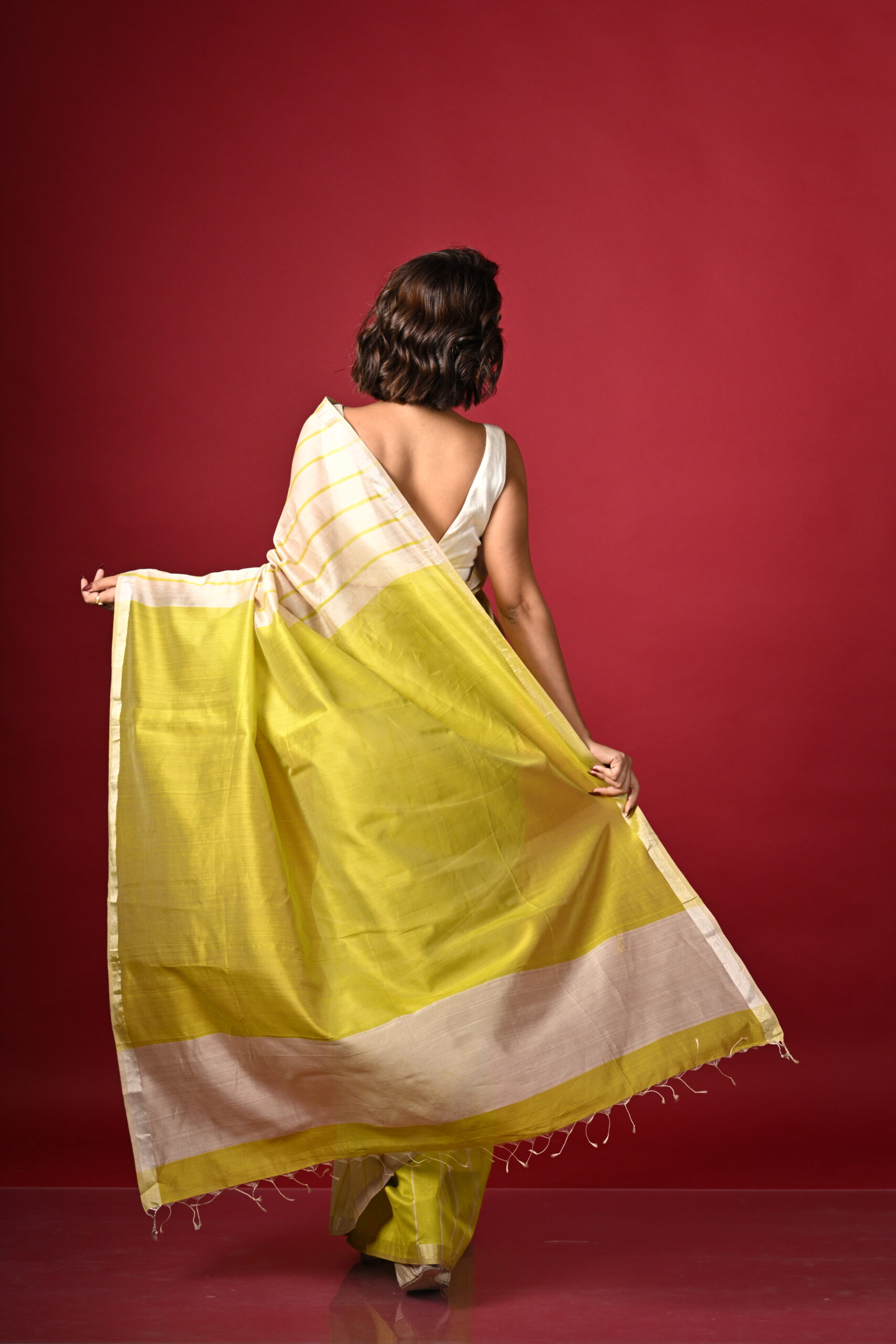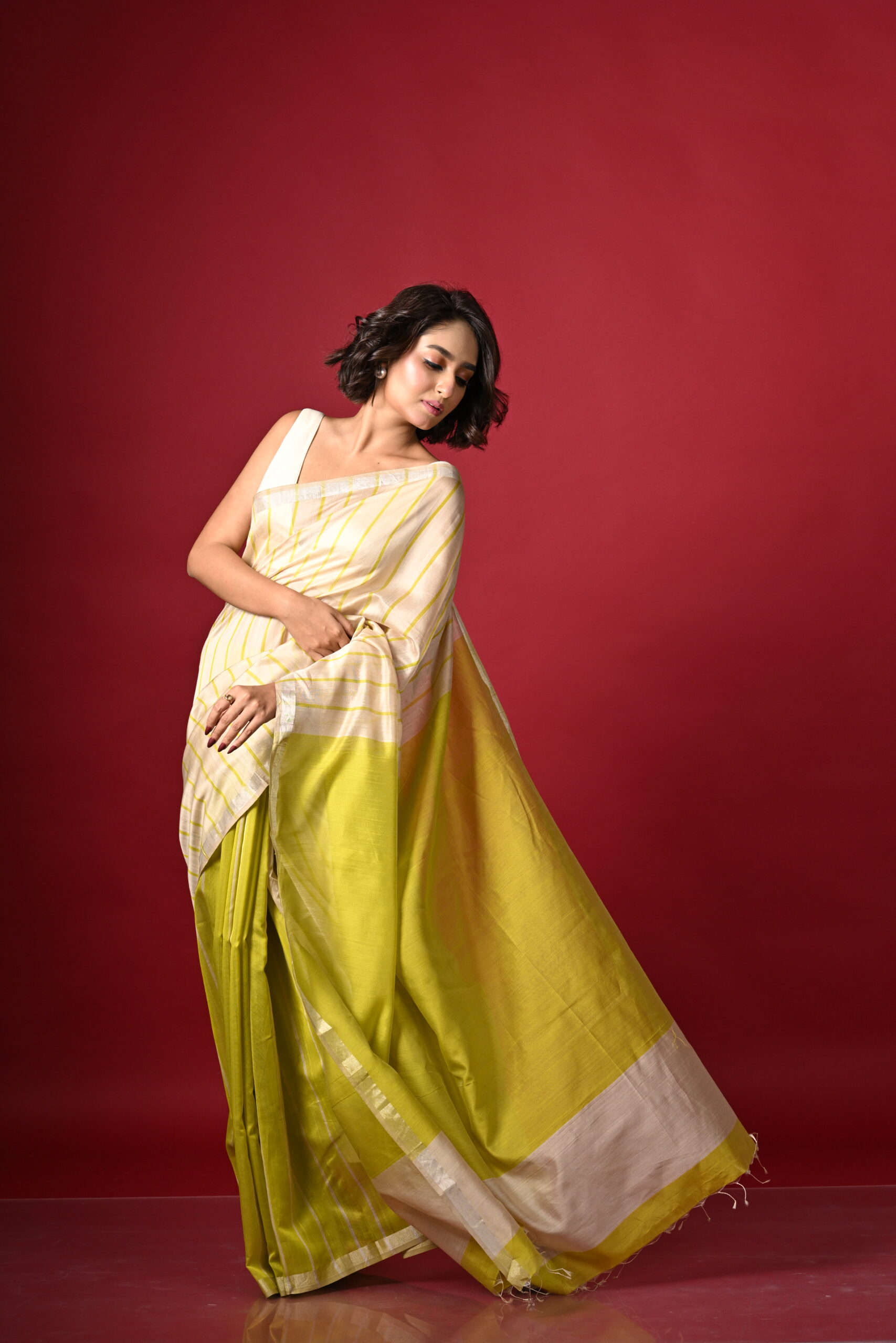 Introducing our elegant silk cotton saree, a tribute to the rich weaving heritage of Maheshwar, Madhya Pradesh. This saree is divided into three sections: the first, up to the pleats, features a light mehendi green base with thin ivory stripes. From the pleats to the pallu, the design is reversed with an ivory base and thin light mehendi green stripes, while the pallu itself is a fresh light mehendi green and ivory stripe along the edge. The saree has a thin silver zari border to bind it all together.