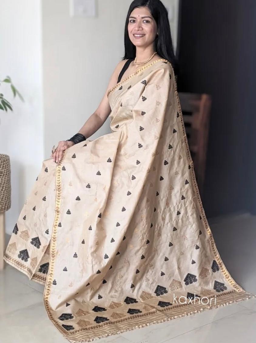 Radiating timeless elegance, this vibrant gold and brown Mekhela Chador is a celebration of Assam’s rich weaving tradition. Handwoven with intricate golden motifs and a beautifully detailed border, it brings together heritage and sophistication in one drape. The soft yet lustrous fabric flows gracefully, making it perfect for festive occasions, weddings, and cultural celebrations.