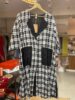 This hand-spun cotton dress features a classic black and white plaid pattern, offering a timeless and versatile aesthetic. The design includes a distinctive black collar and two prominent black patch pockets on the front, adding both style and functionality. With its relaxed fit and three-quarter sleeves, this dress provides comfortable wear while maintaining a chic appearance suitable for various occasions.