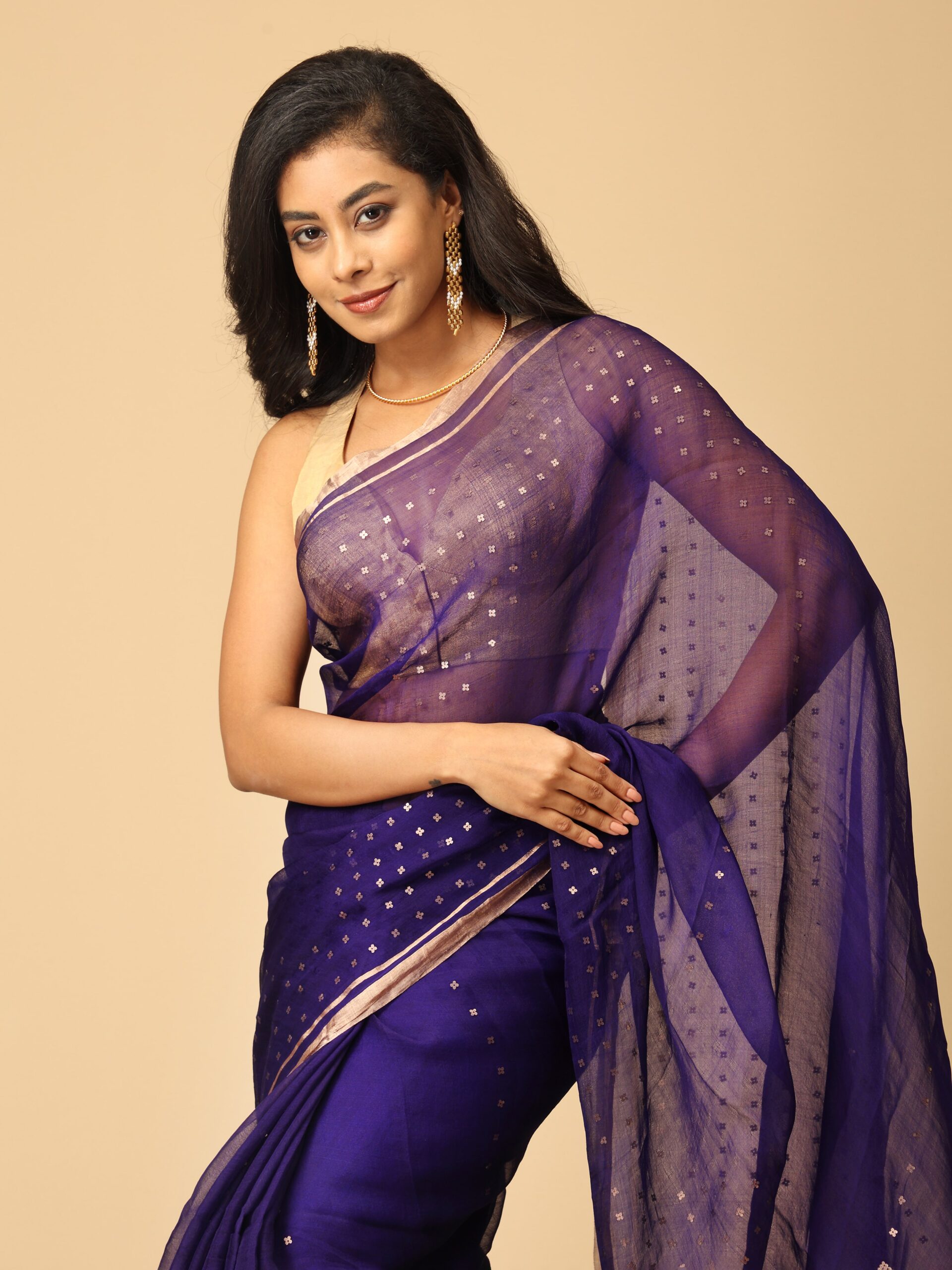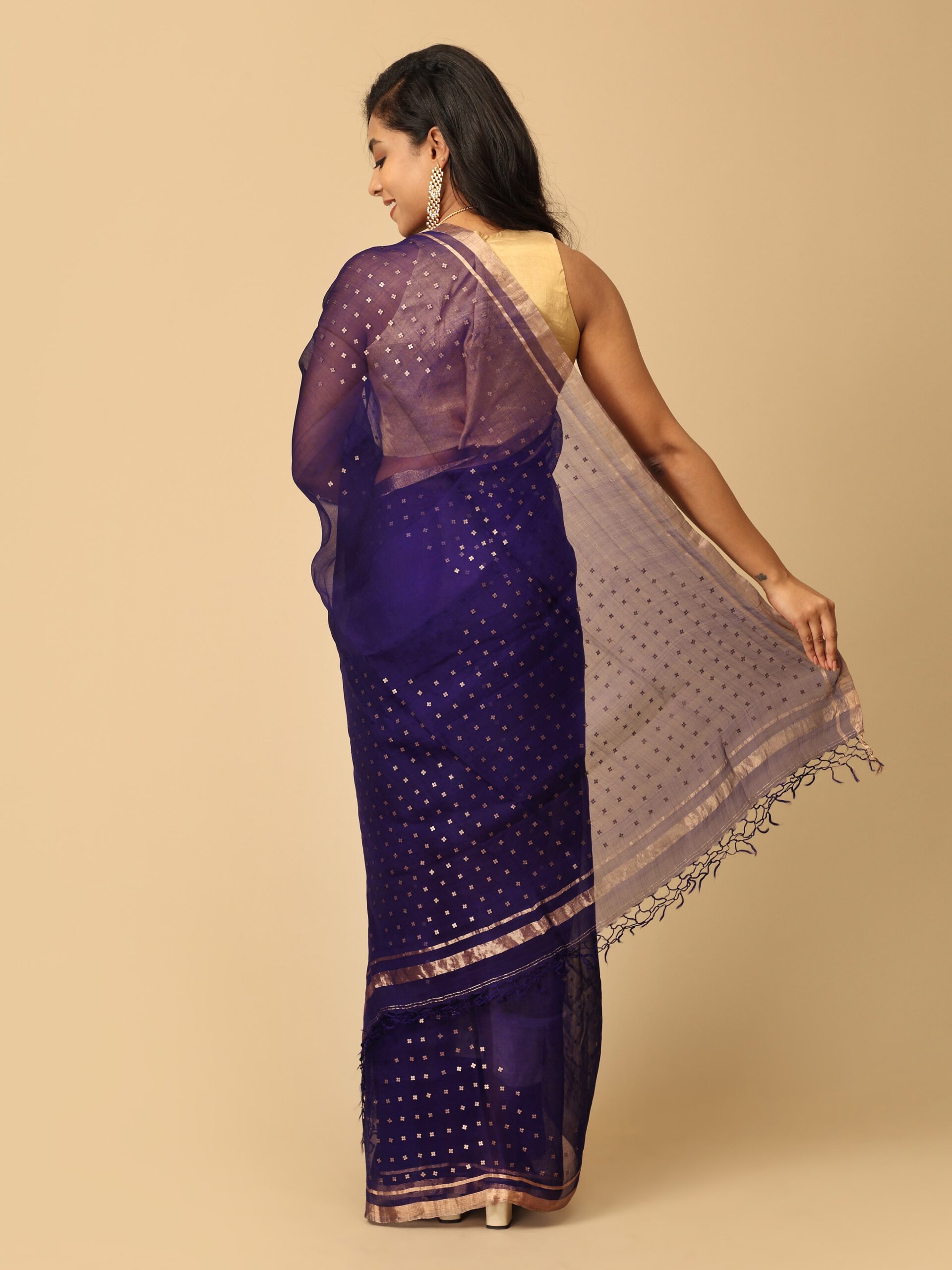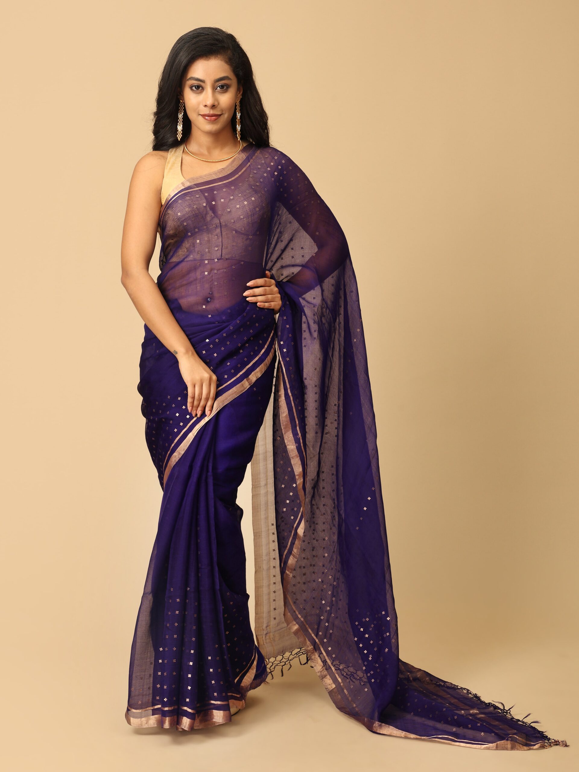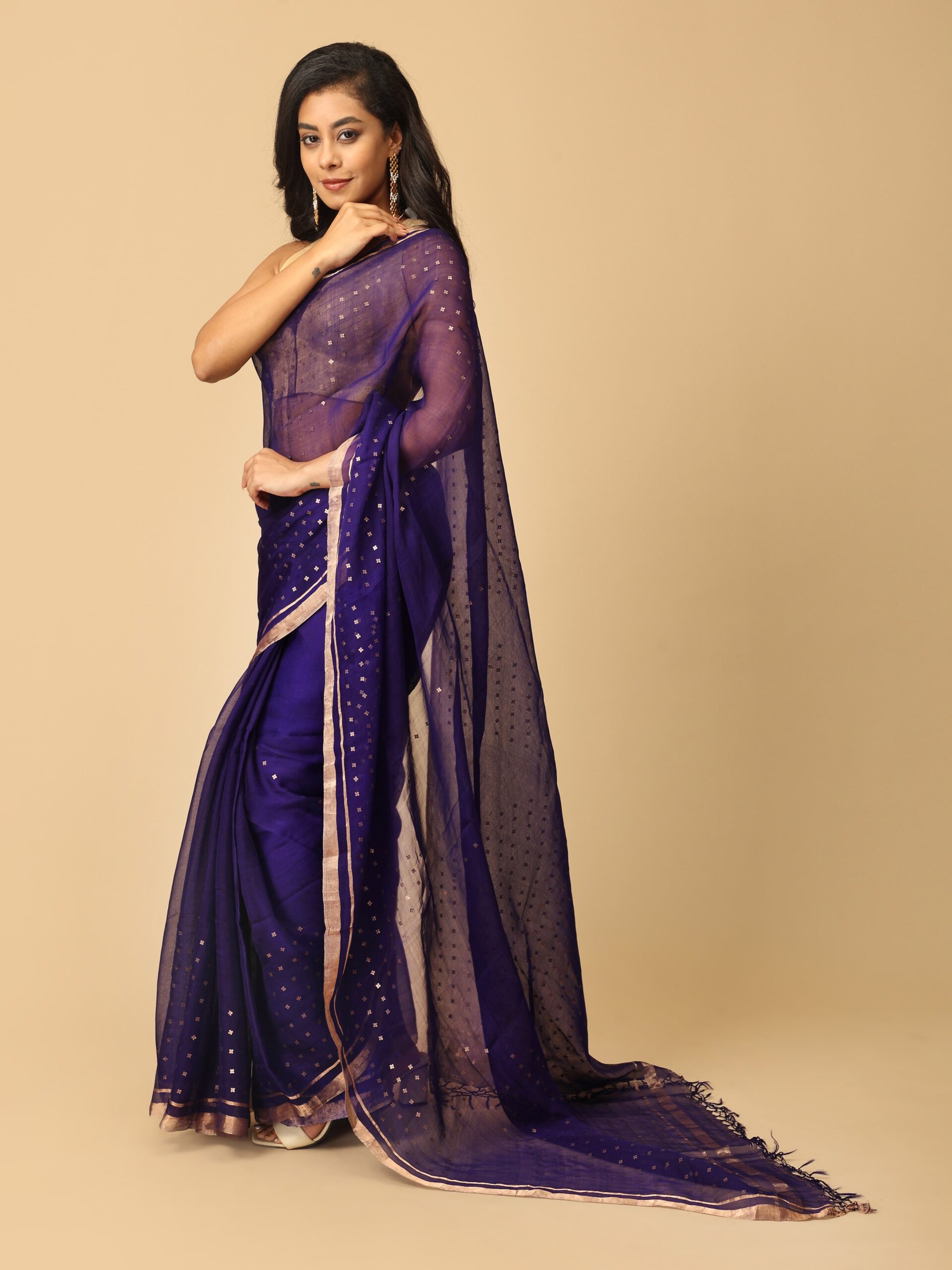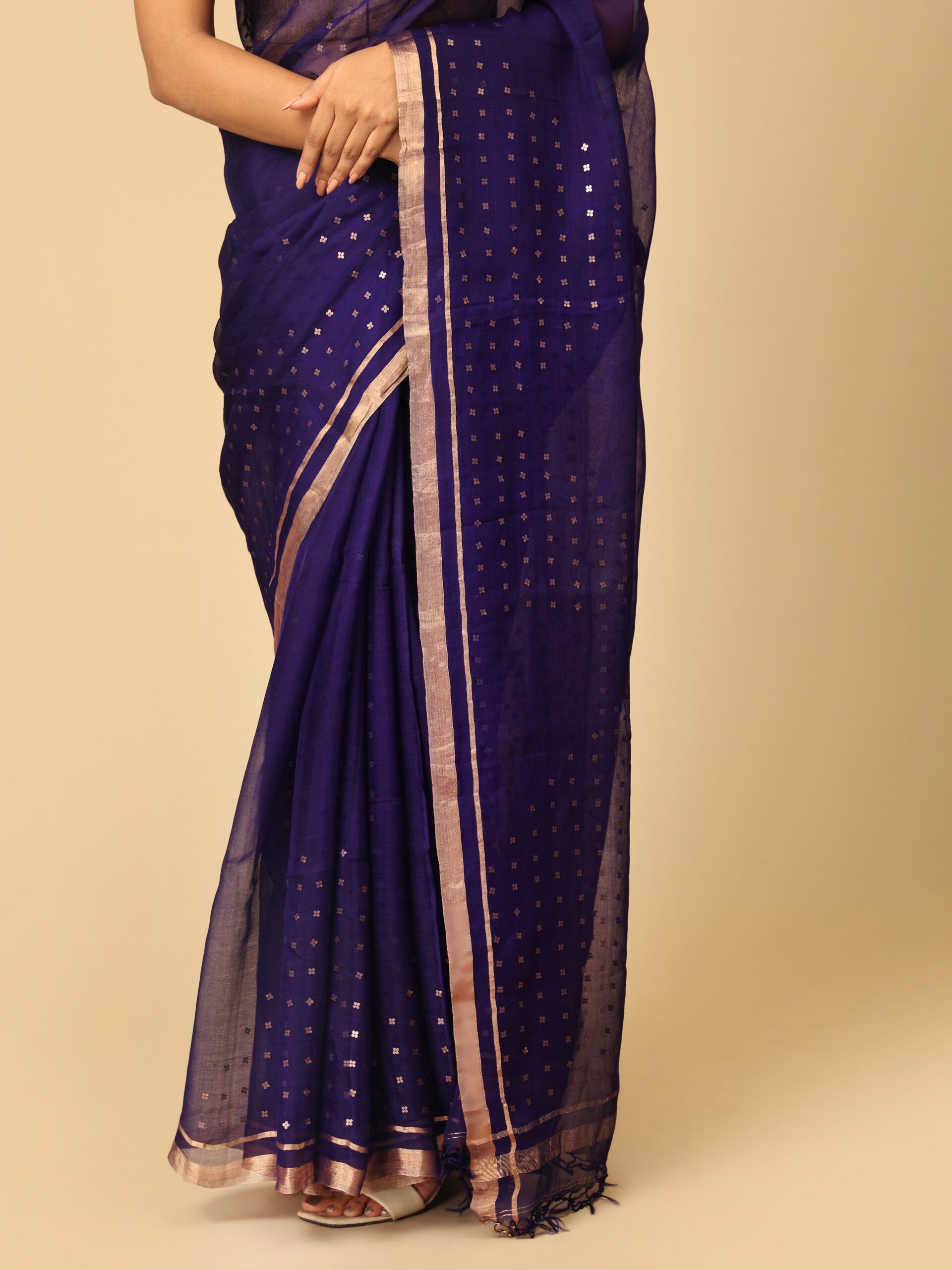 Pure Fine Lavender Muslin Silk Saree With Handweaving Sequin Design Work Border And Pallu from West Bengal. The sequin work done here is extra special as the sequins are woven into at the time of weaving the saree, termed as “pocket sequin” and are not stitched to the saree. This ensures that the sequins remain permanently attached. Extremely light weight , simple yet glamourous.