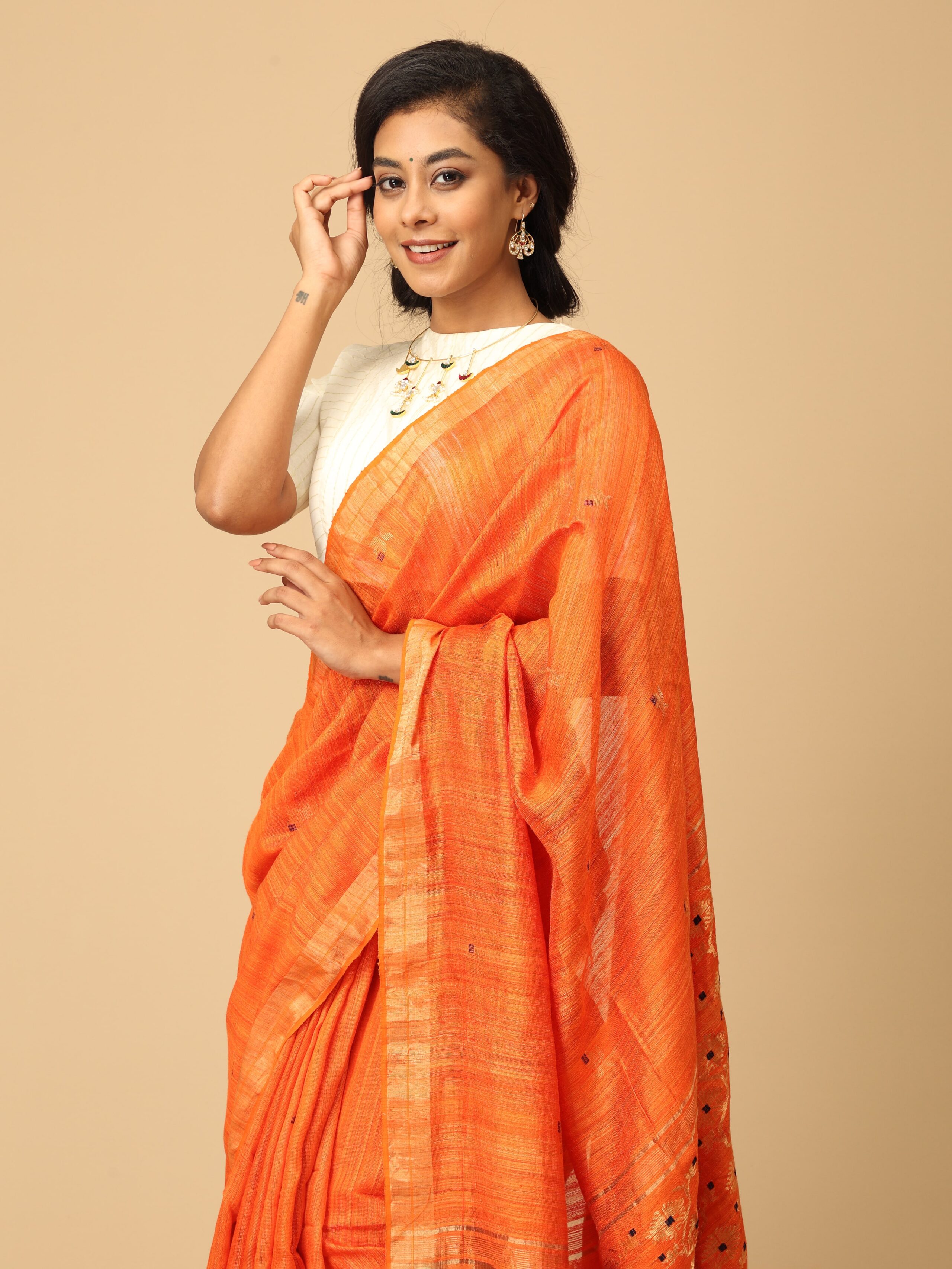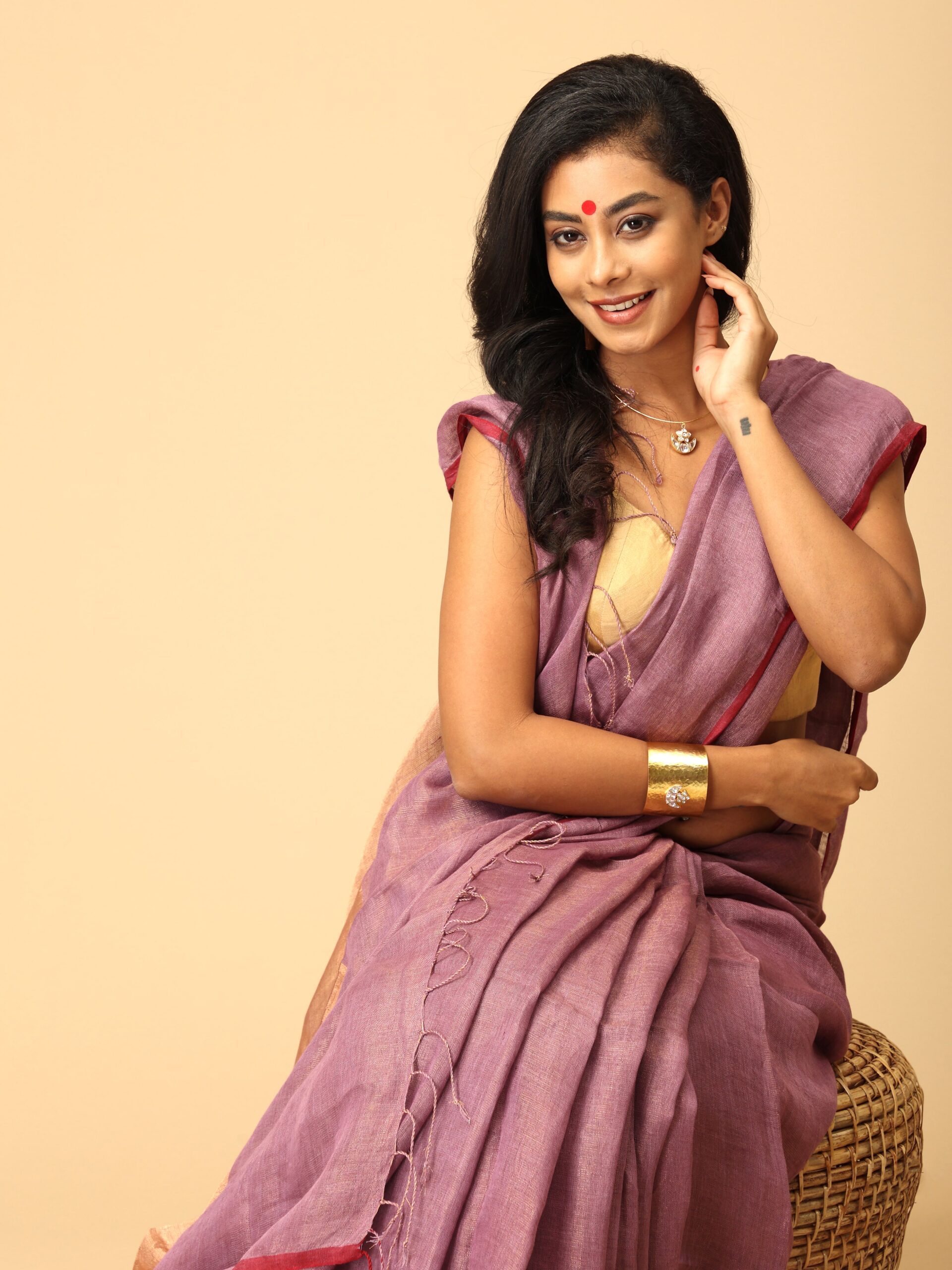 Linen and Zari Saree in mauve and red border. The lightweight linen fabric from West Bengal drapes gracefully, while intricate zari work, often in gold or silver, adds a touch of opulence with traditional motifs. These sarees are perfect for both festive occasions and casual wear.