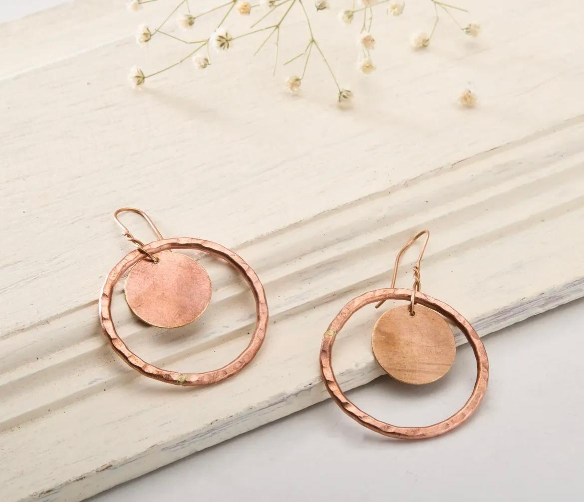 Elevate your style with these exquisitely handcrafted copper hoop earrings, a perfect blend of rustic charm and contemporary elegance. Each earring features two meticulously hand-forged copper hoops, gracefully interlocking to create a dynamic and eye-catching dangle design. The warm, rosy hue of the copper adds a touch of natural beauty, while the subtly hammered texture catches the light, giving these earrings a unique and artisanal appeal.