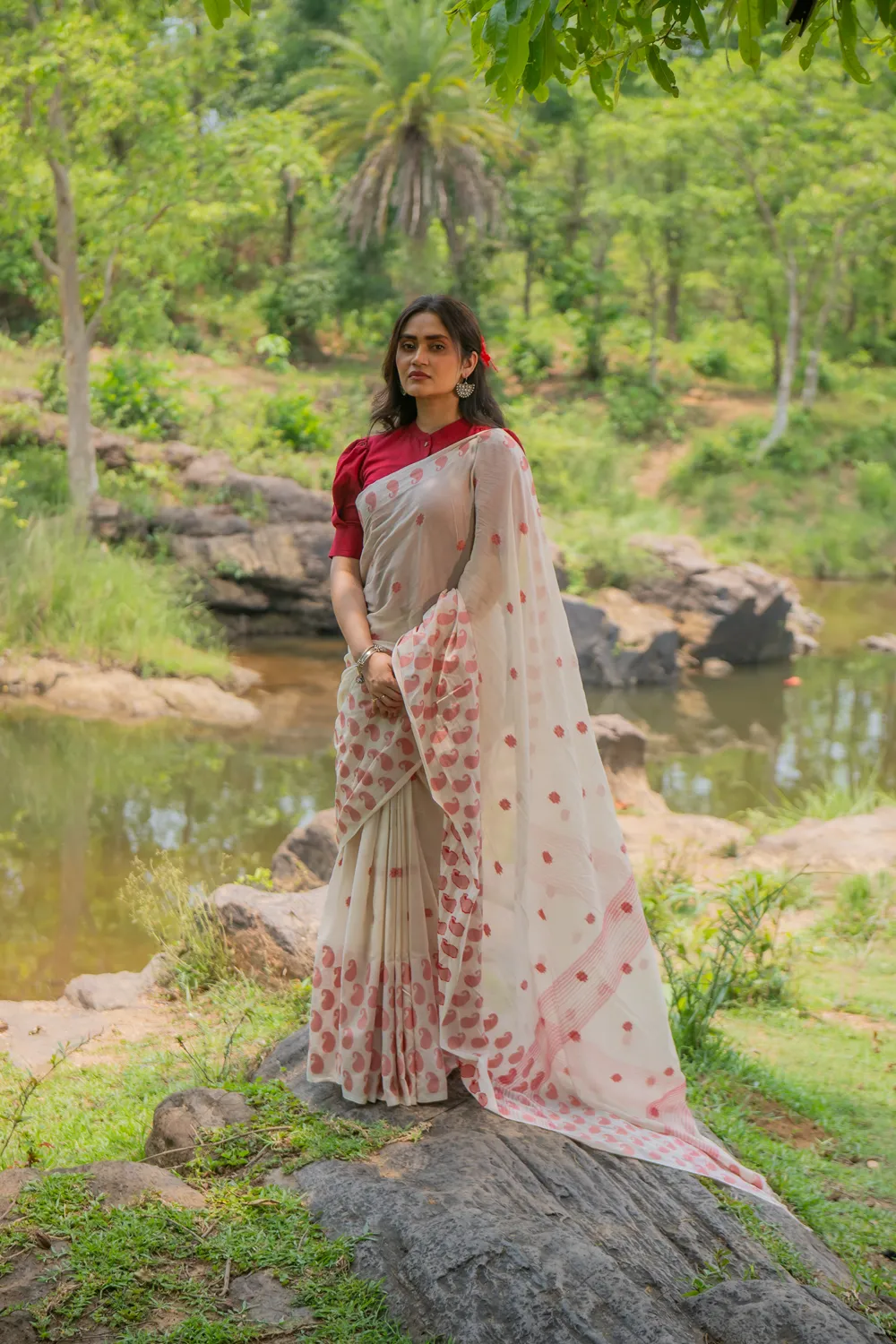 Off White and Red Paisley Soft Cotton Jamdani Saree
