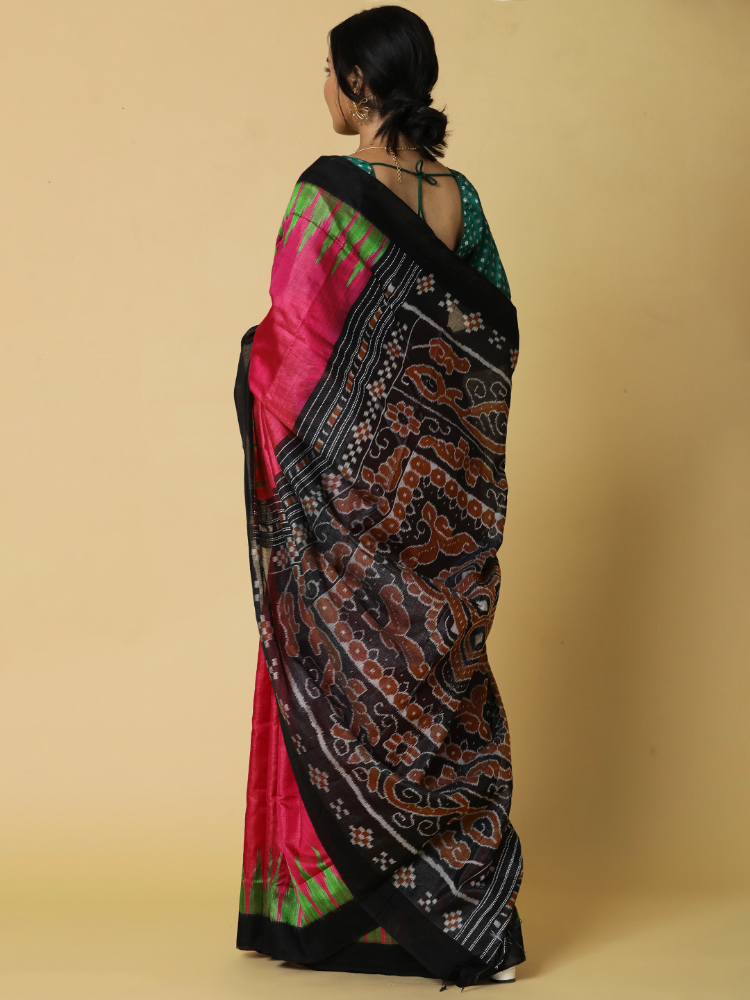 A visually striking saree featuring contrasting colours of Black, Green and Pink.The Saree in Tussar is sophisticated, dramatic and feminine.The combination of these colors can create a very modern yet traditional look.