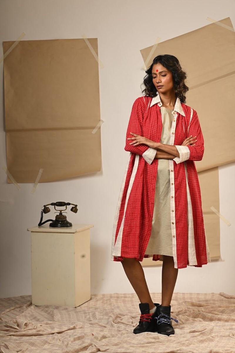 This elegant and stylish indo-western dress features a unique design with box pleats all over, creating a dynamic and textured look. The inside of each box pleat is crafted from a contrasting fabric, providing a subtle yet striking visual contrast to the outer fabric. This interplay of materials adds depth and sophistication, making the dress a standout piece for any occasion.