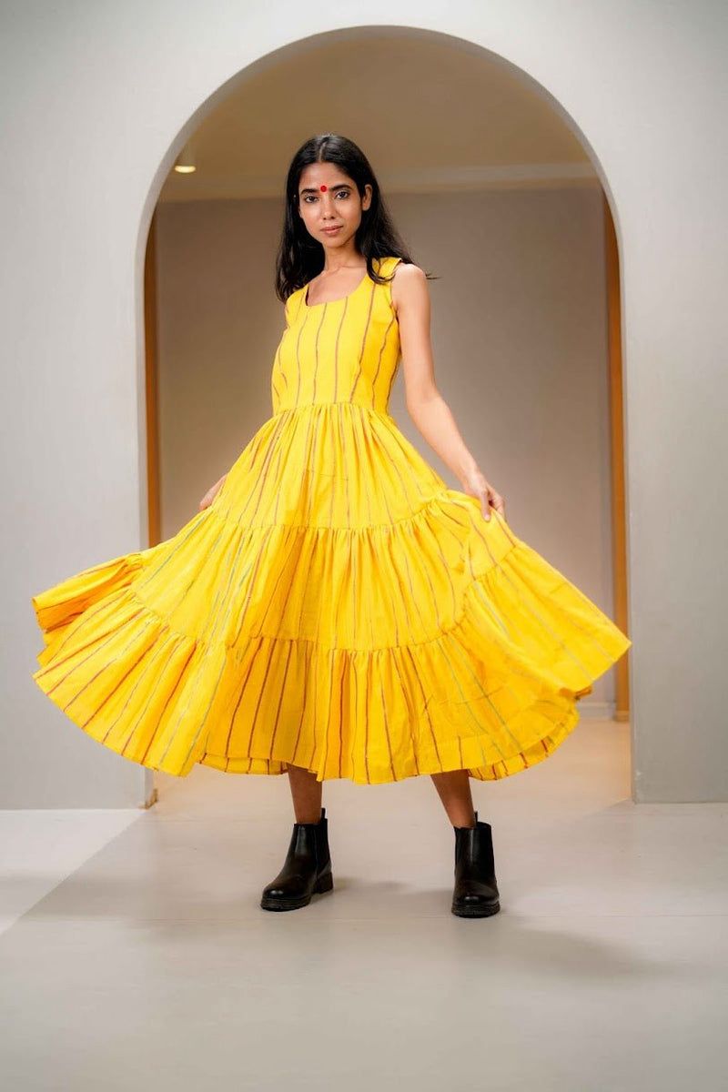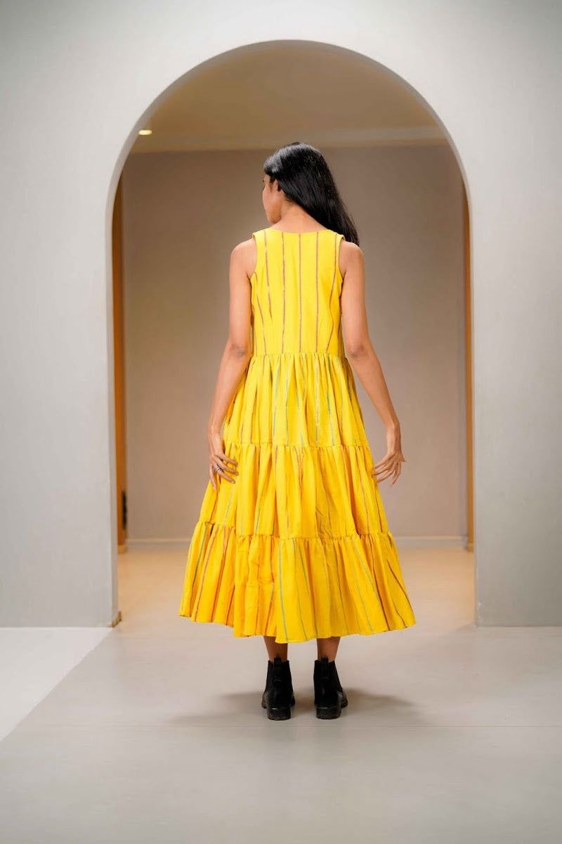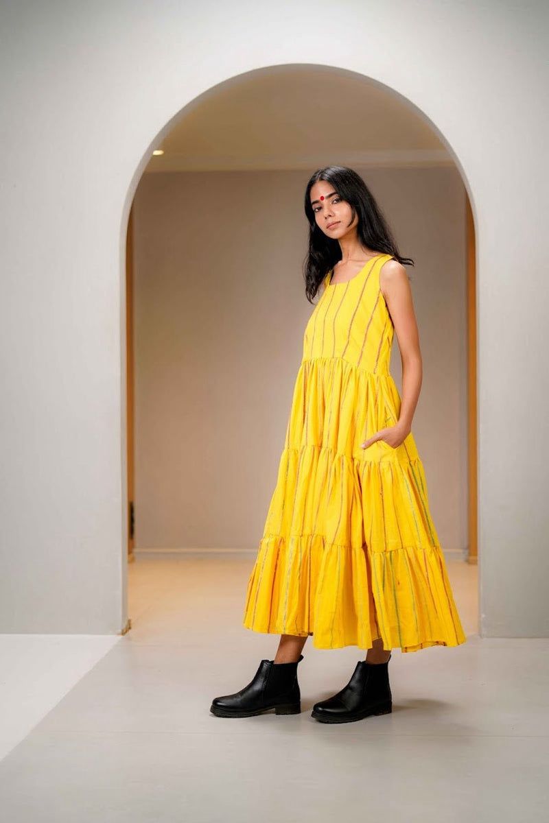 This Sunshine Yellow Khesh Tier Dress is a vibrant and chic choice for any occasion. Designed with three gathered tiers, it offers a voluminous flare that enhances its playful charm. Featuring a round neck, sleeveless design, calf length, and functional pockets, this dress is as practical as it is stylish. It can also be styled with a belt for a more structured look.